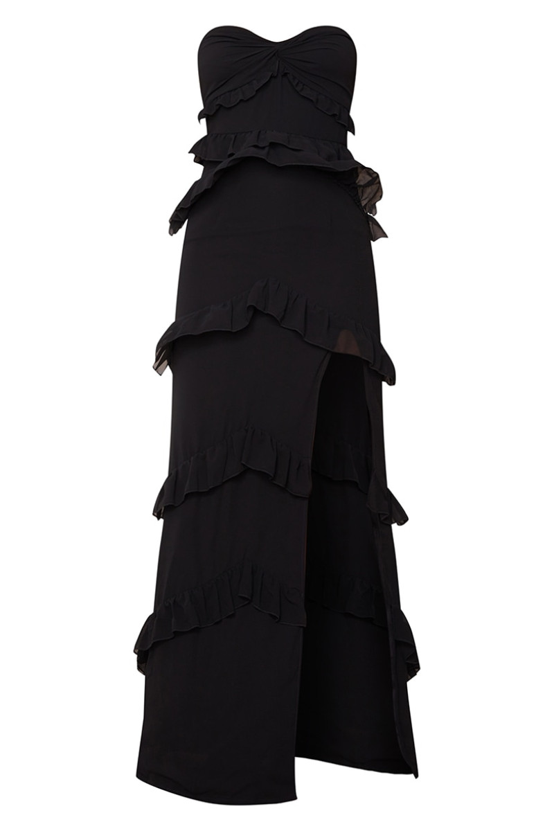 Чорна багатоярусна сукня-бандо з закрученою стрічкою