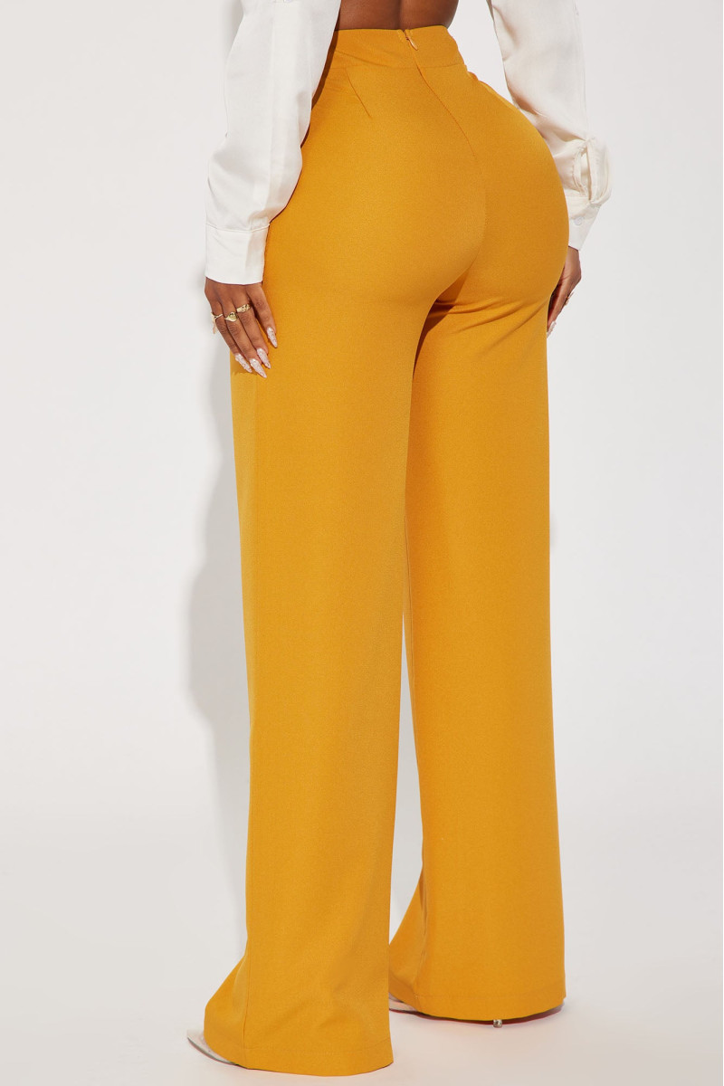 Класичні штани-брюки з високою посадкою. Модель прикрашена двома ґудзиками спереду та елегантними складками. Застібка-блискавка непомітно розташована ззаду. Зручні бічні кишені та прямий крій штанини створюють витончений силует. Матеріал не тягнеться, забезпечуючи ідеальну форму. Рекомендації щодо догляду допоможуть зберегти вишуканий вигляд виробу. Склад: 95% поліестер, 5% спандекс.