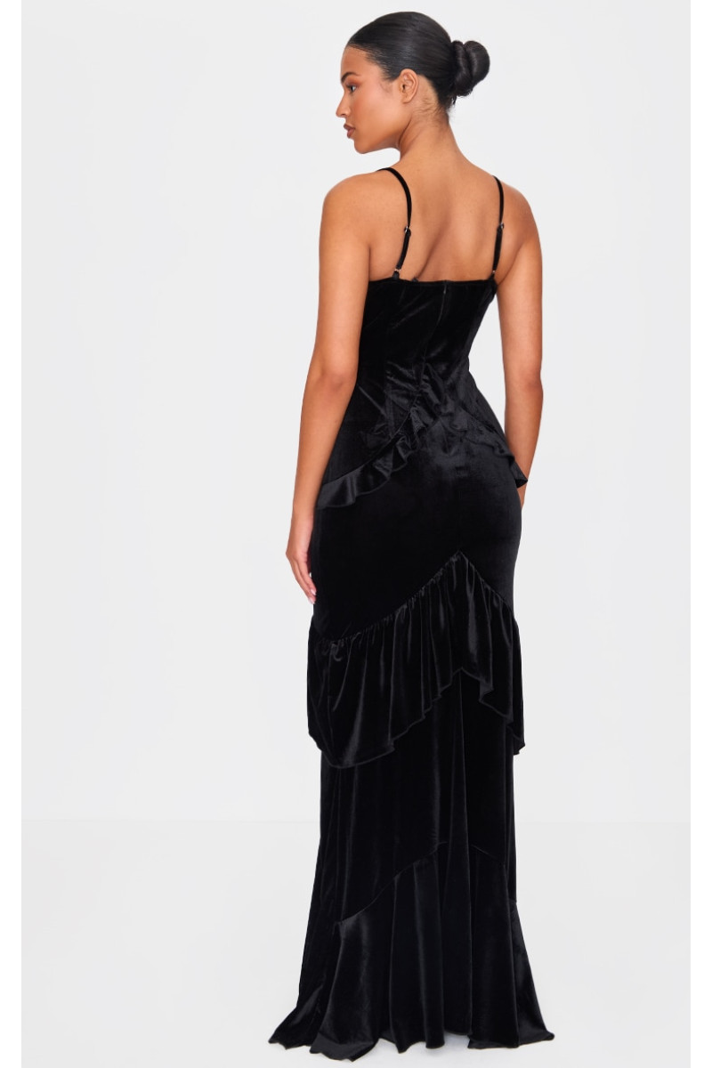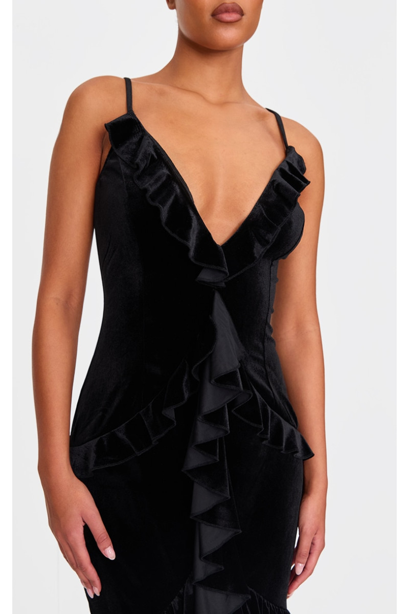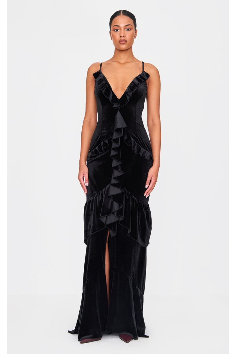 Ця висока чорна оксамитова сукня максі з оборками вирішила ваші дилеми щодо того, що одягнути. Ця максі-сукня, виконана з оксамиту чорного відтінку з фактурним малюнком і оборками, — це все нове, що вам потрібно, і багато іншого. Стиль із туфлями на підборах і простими аксесуарами для вишуканого силуету, який обов’язково приверне увагу. Довжина приблизно 163 см/64 дюйми (на основі розміру вибірки UK 8) На моделі одягнено розмір UK 8/ EU 36/ AUS 8/ US 4. Зріст моделі — 5 футів 10 дюймів. Категорія: Сукні. Тип продукту: Обтягуюча сукня. : Пригода без рукавів: вечір