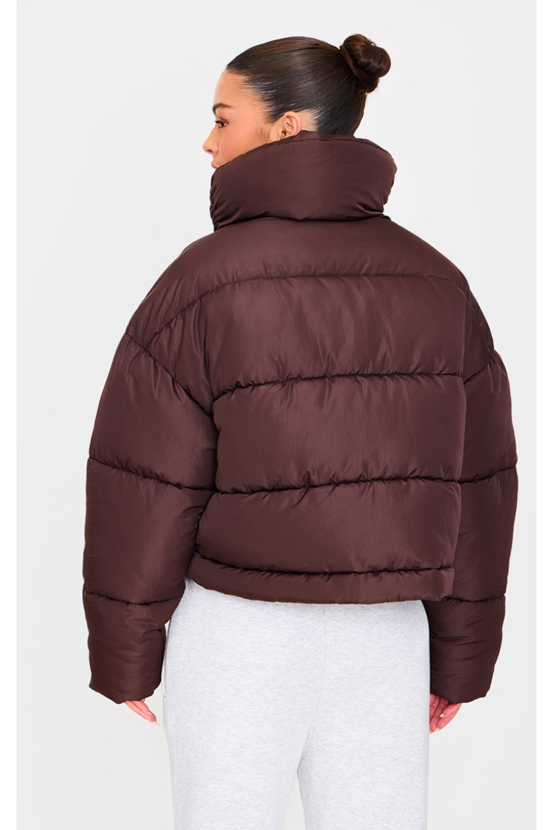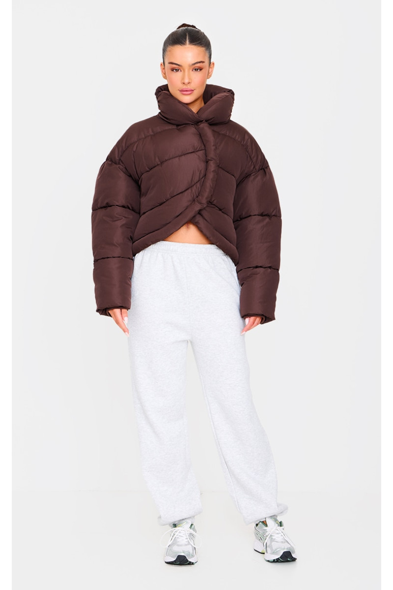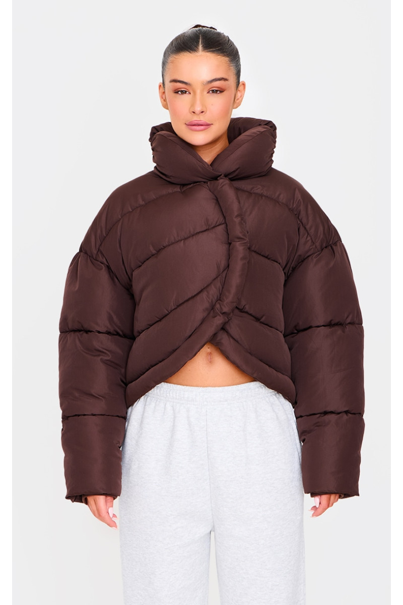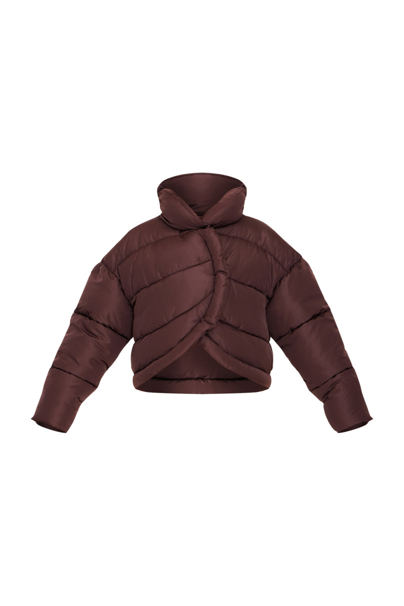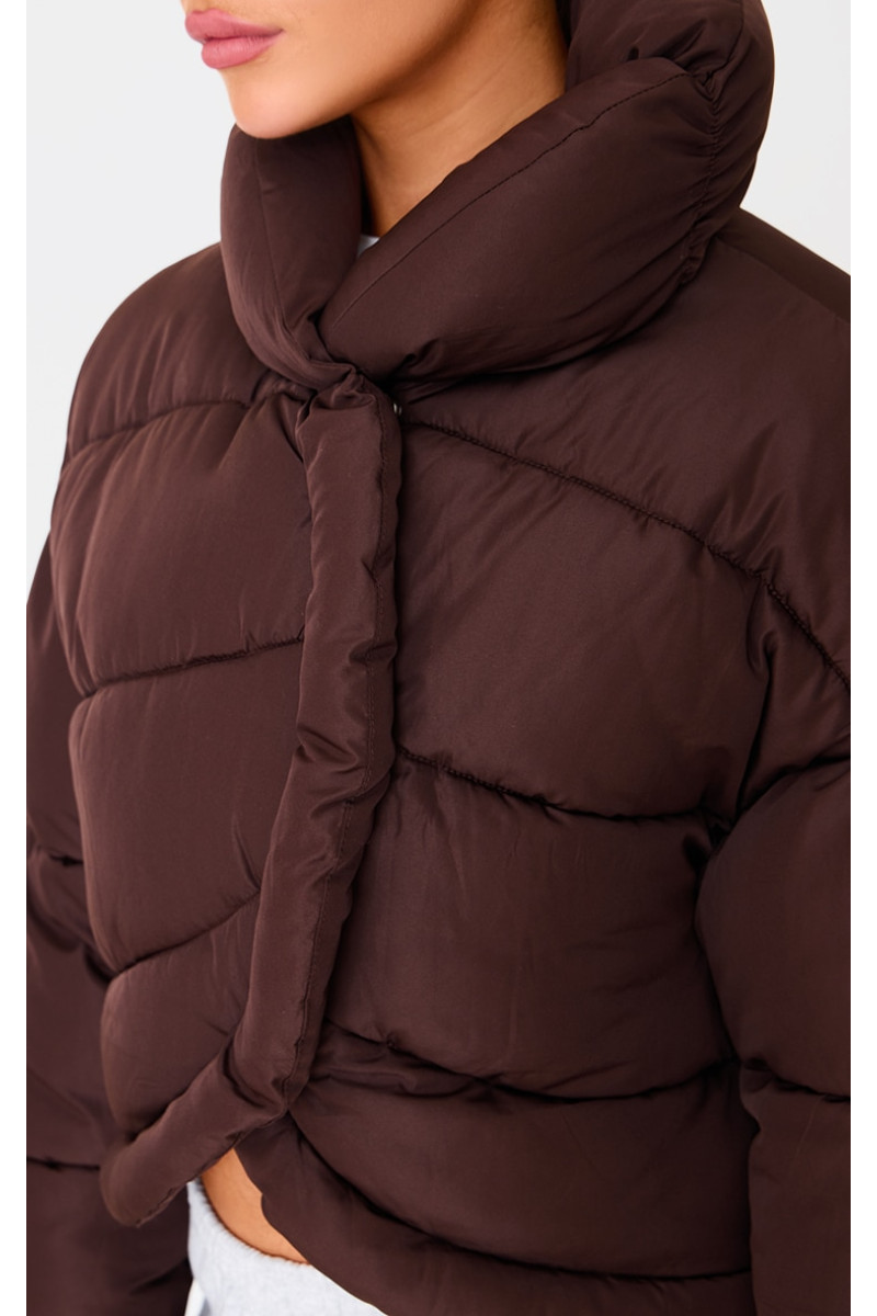 Шоколадно-коричнева стьобана асиметрична куртка-пуховик з високим горлом