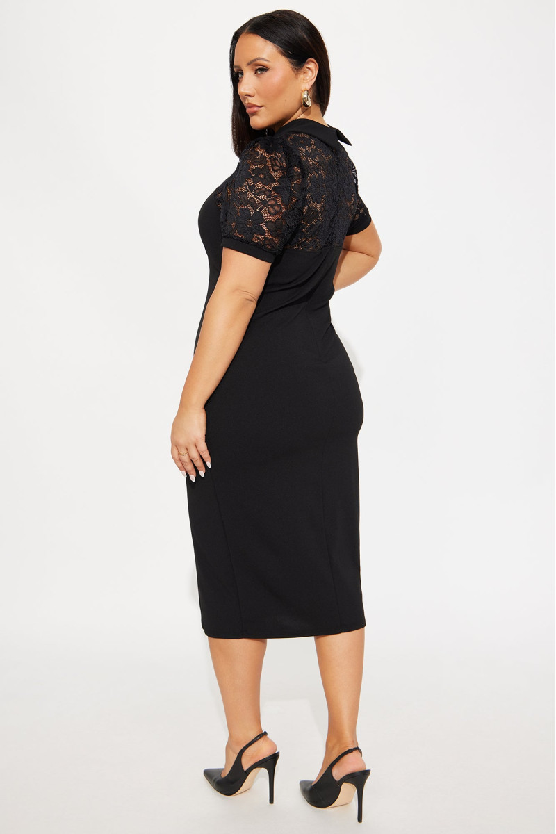 Вишукана міді-сукня з коротким рукавом, комірцем та ґудзиками спереду. Верх прикрашений витонченим мереживом. Тканина приємно тягнеться. Довжина виробу (у плоскому стані): 45 дюймів. Склад: 95% поліестер, 5% спандекс. Контрастна тканина: 90% нейлон, 10% спандекс. Імпортний товар.