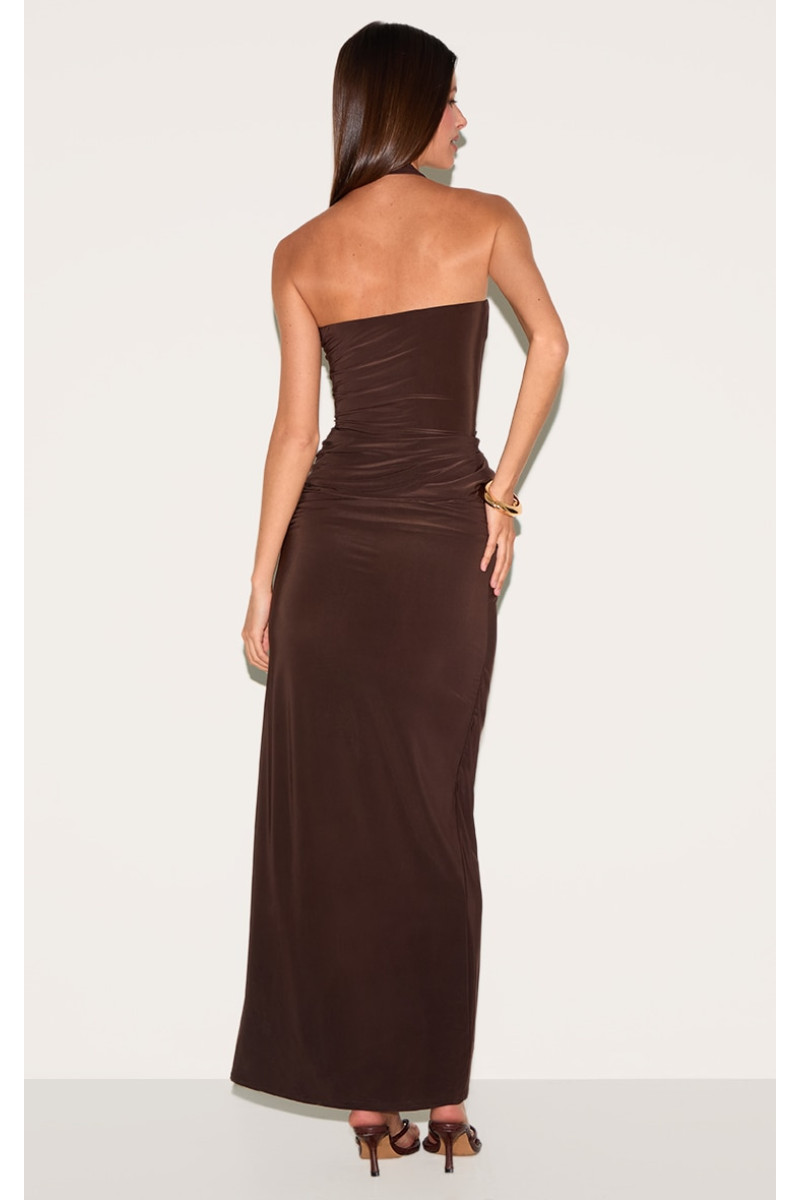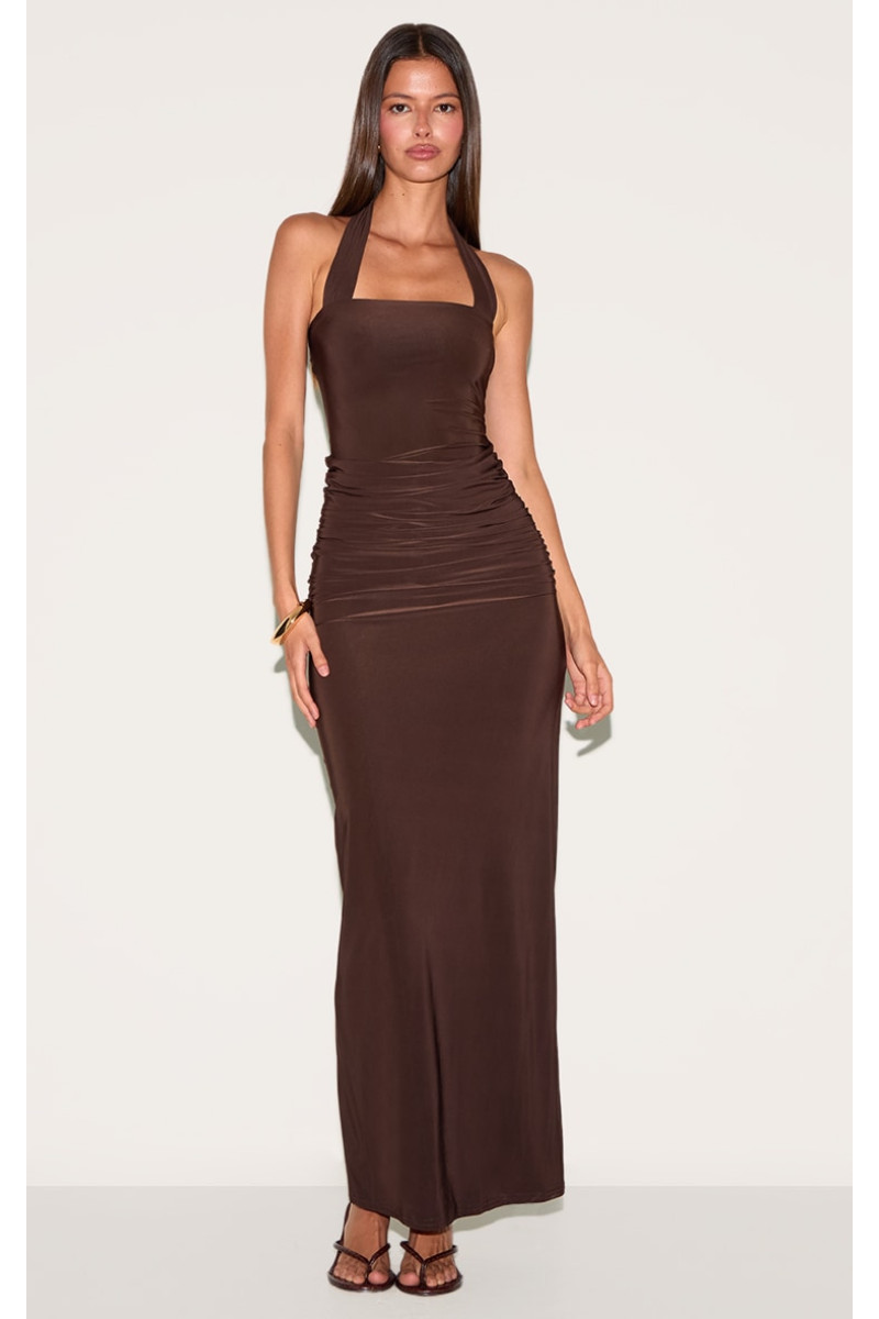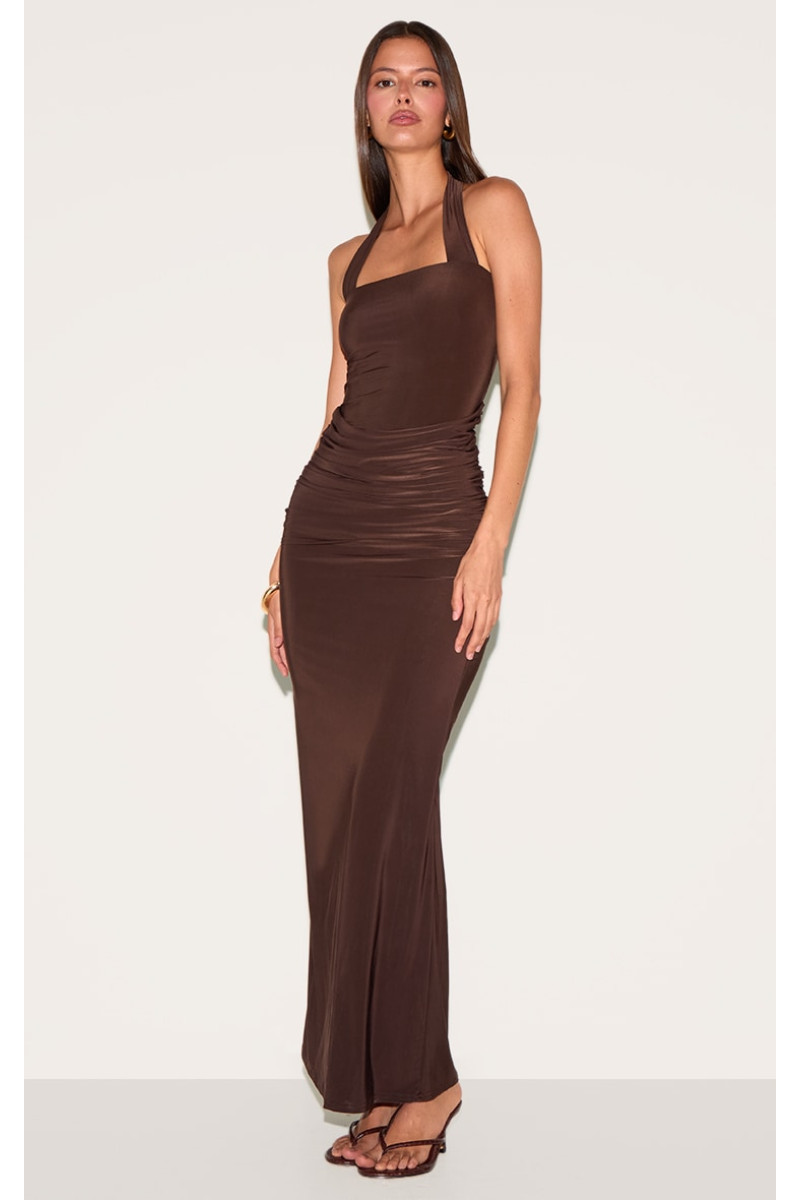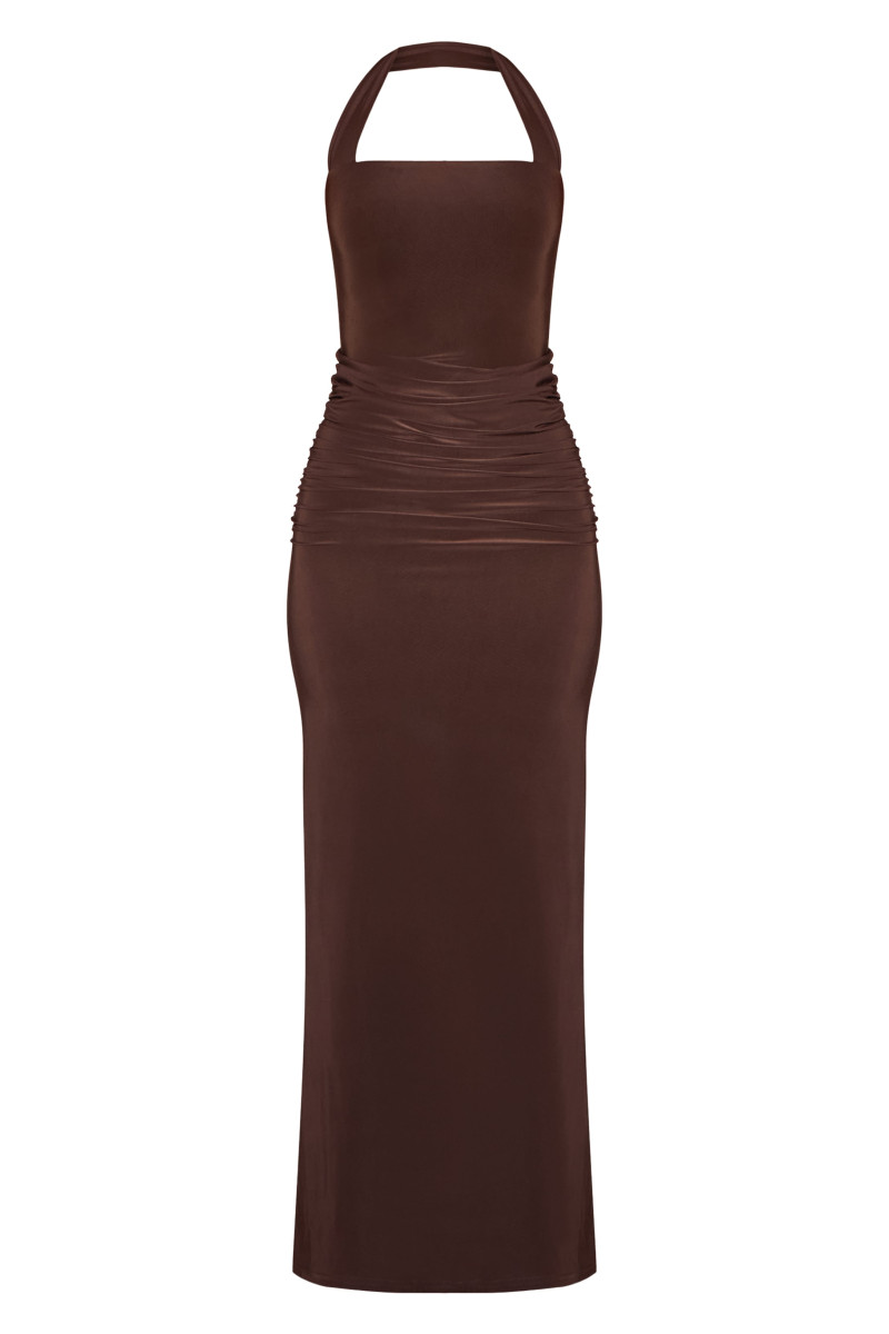 Шоколадний подвійний шар слизький квадратний халтернек деталей драпірування максі плаття